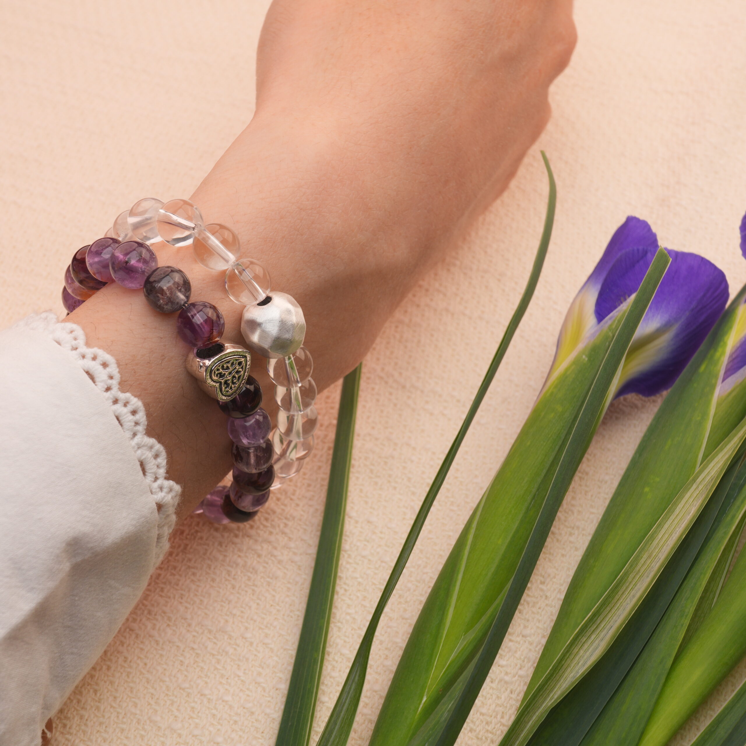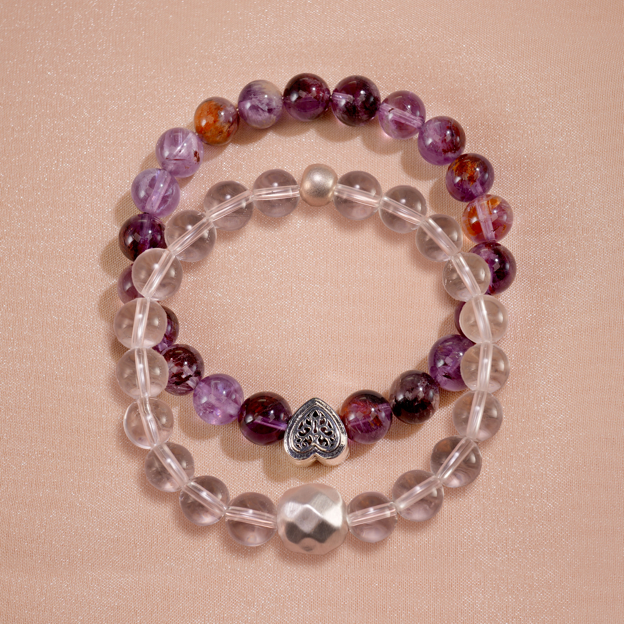 - Set includes two separate bracelets: one purple phantom quartz, one clear quartz
