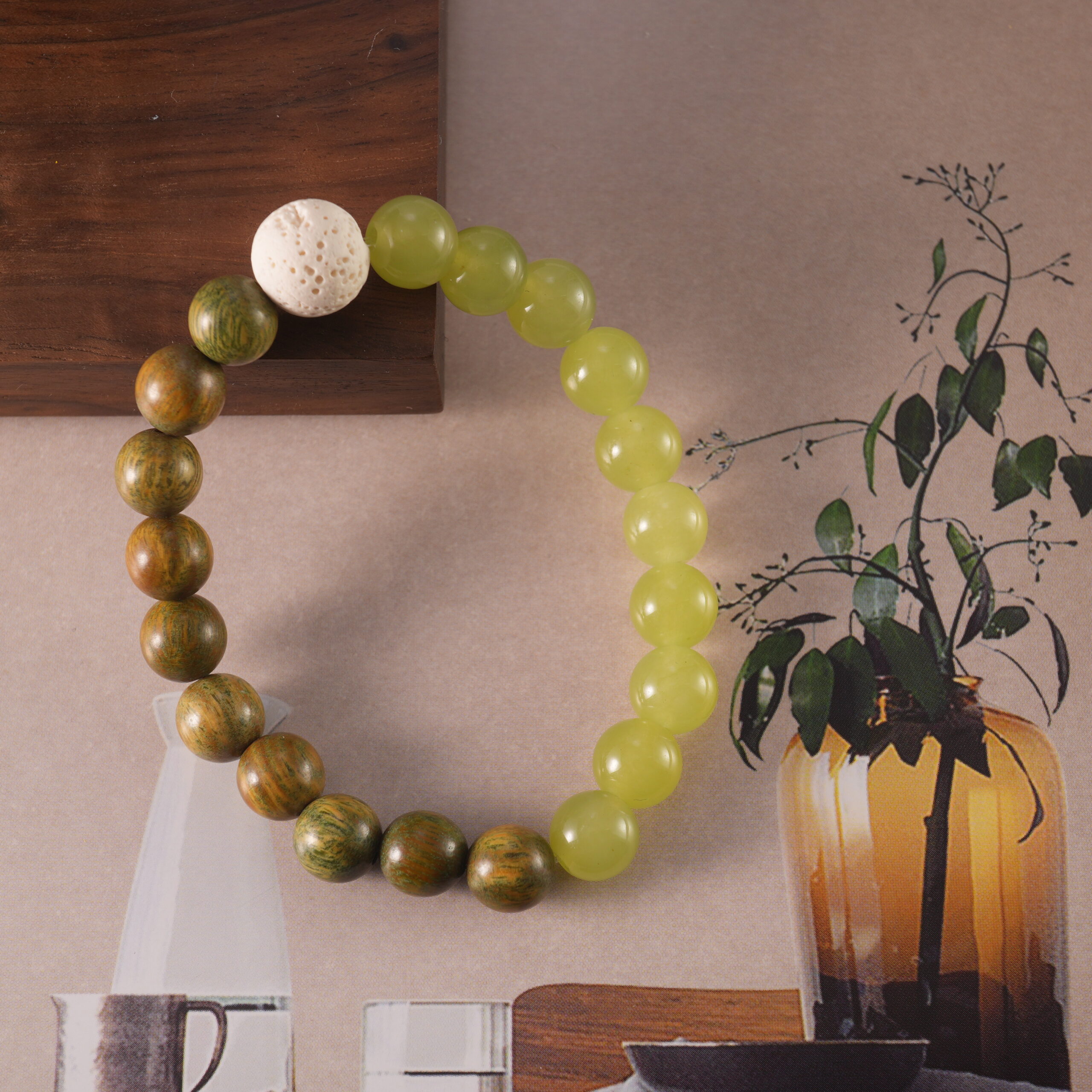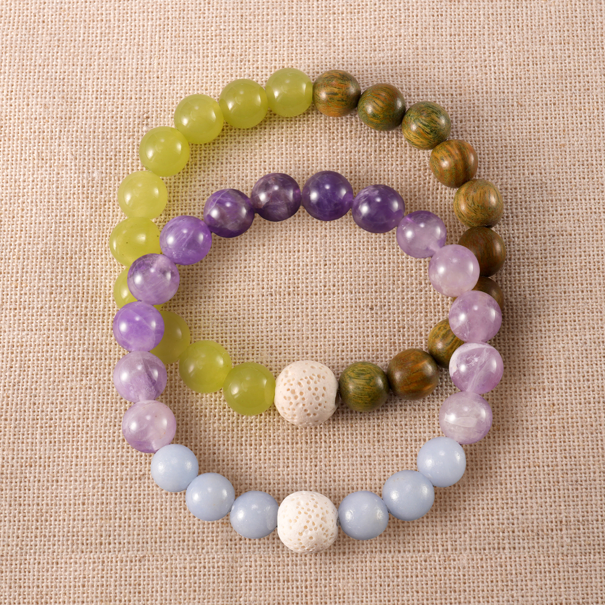 - Handcrafted stacking bracelets made with sandalwood, amethyst, and lava stone