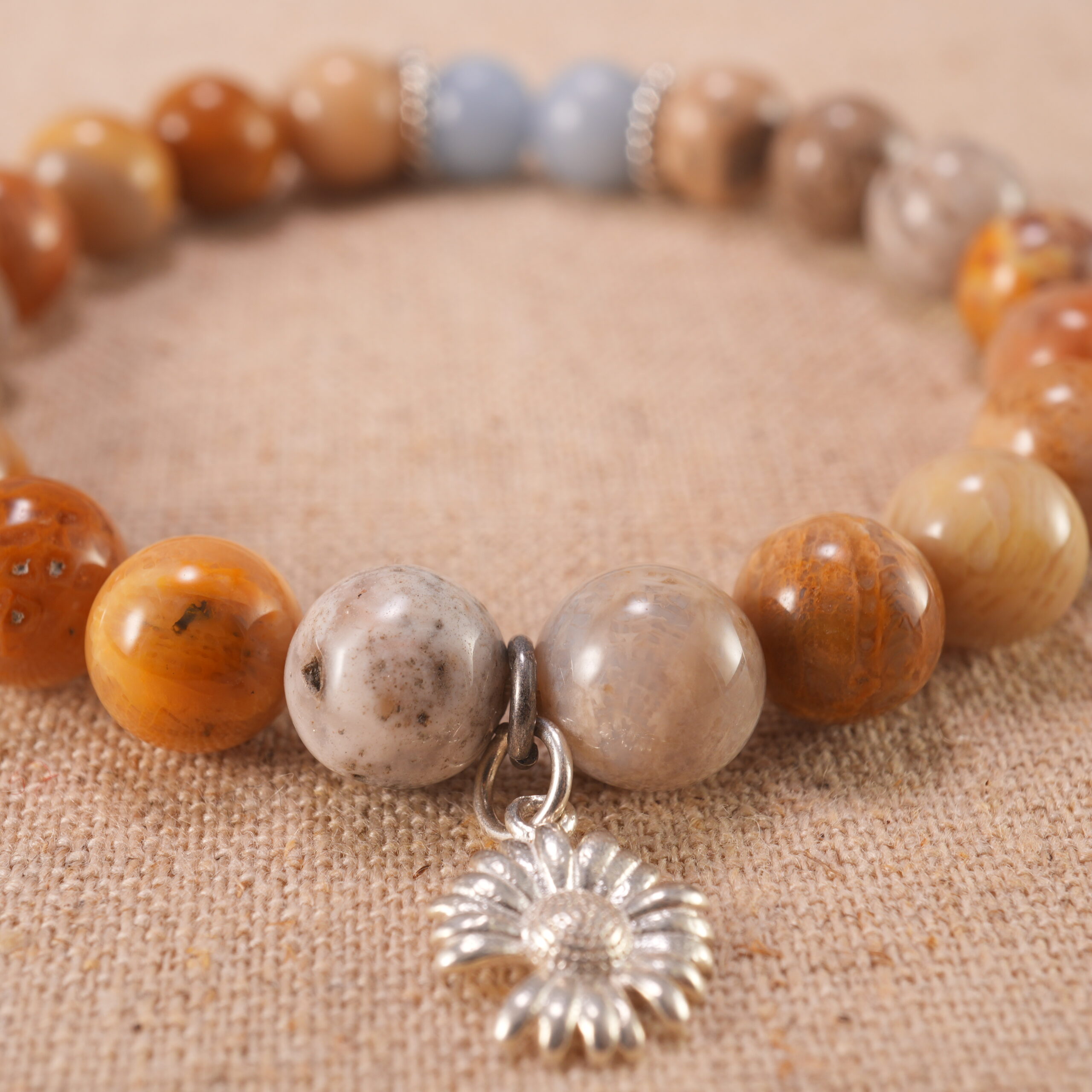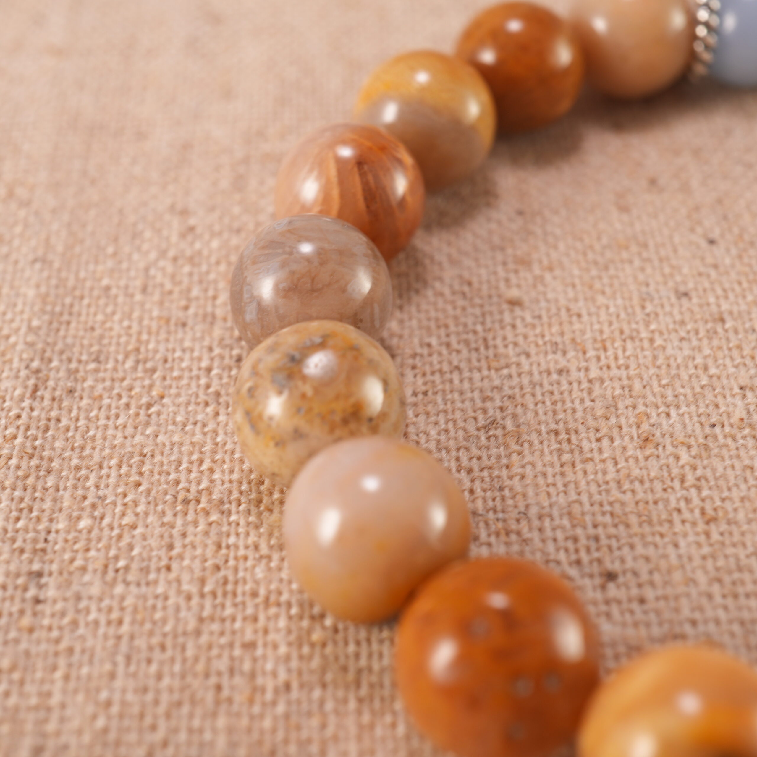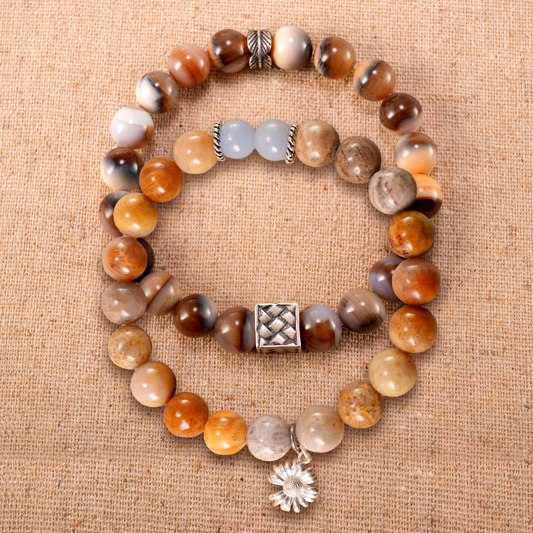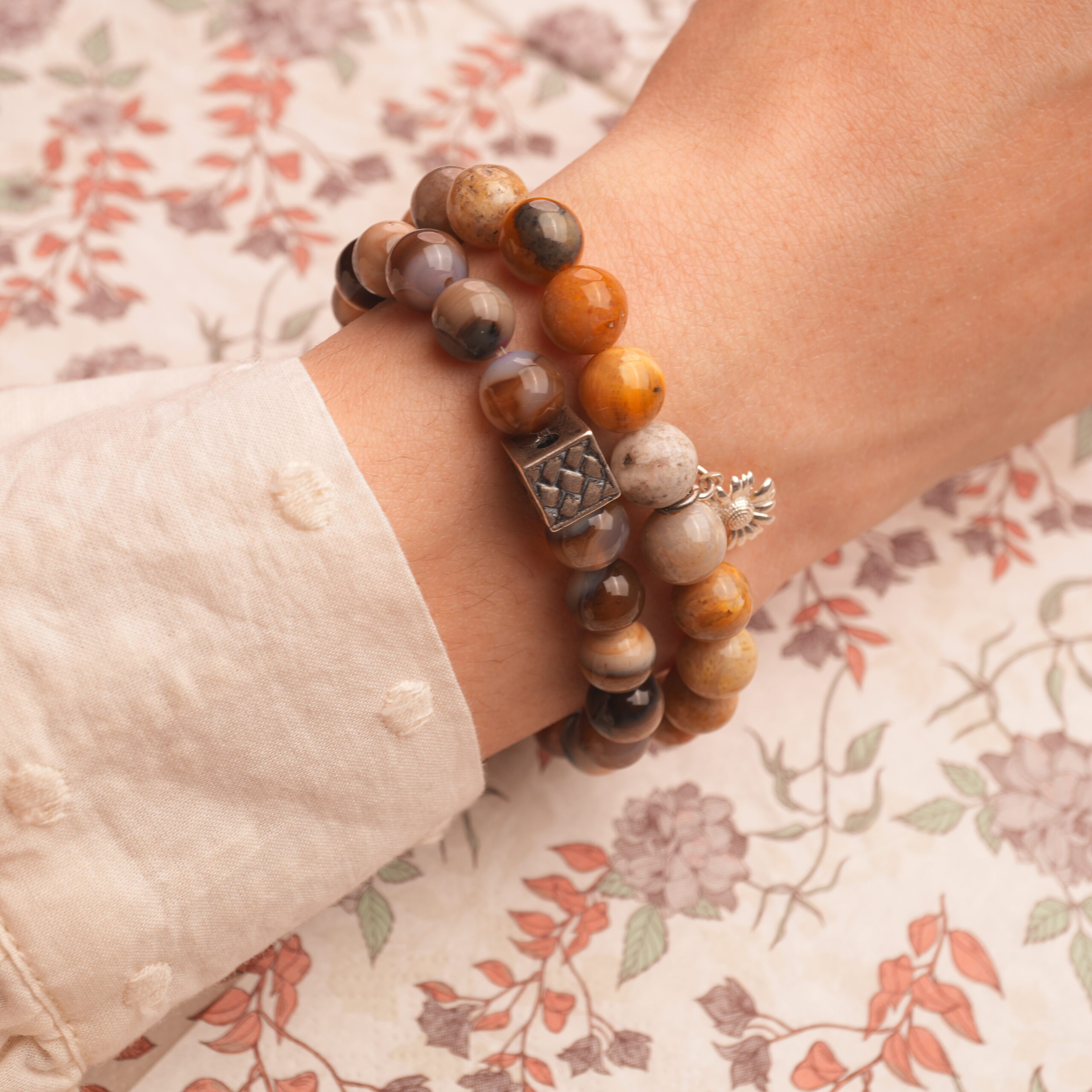 This three-bracelet stack combines striped agate, picture jasper, and blue chalcedony—designed to ground your energy, promote calm communication, and restore inner balance.