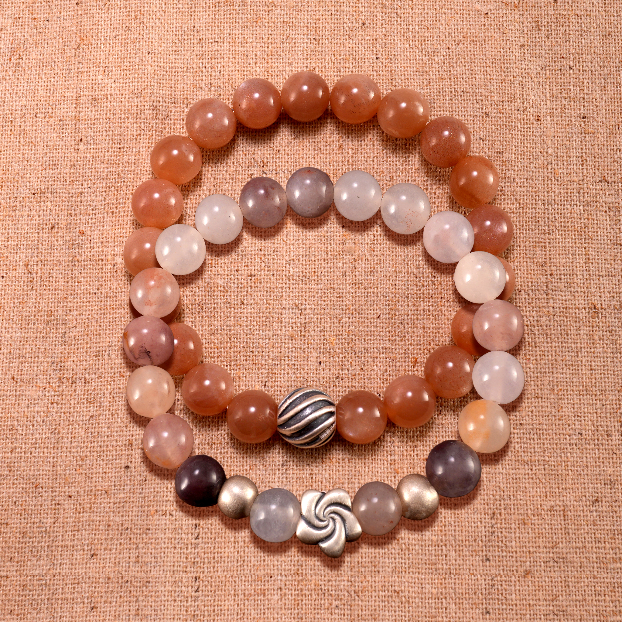 - Includes two separate bracelets: peach moonstone & green aventurine