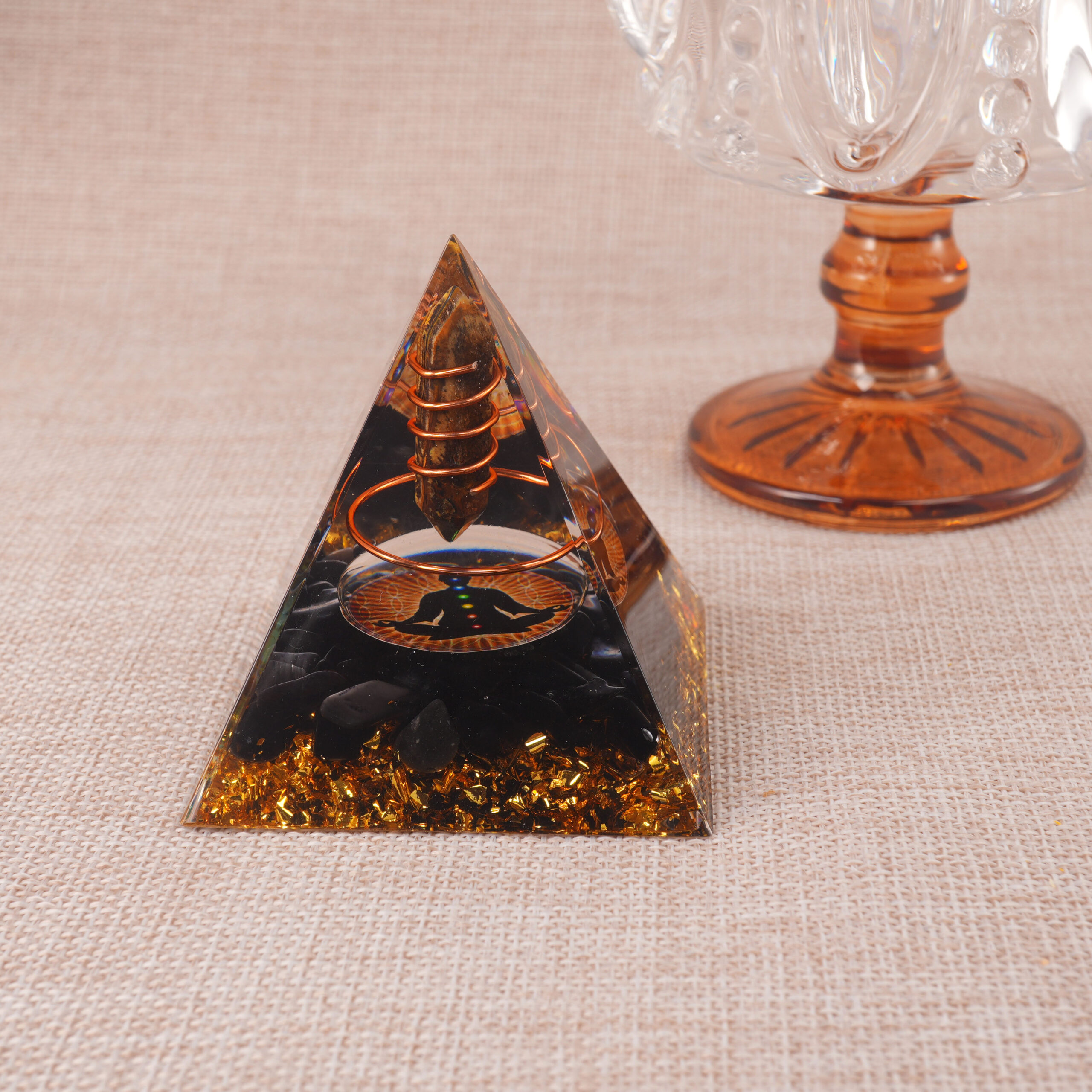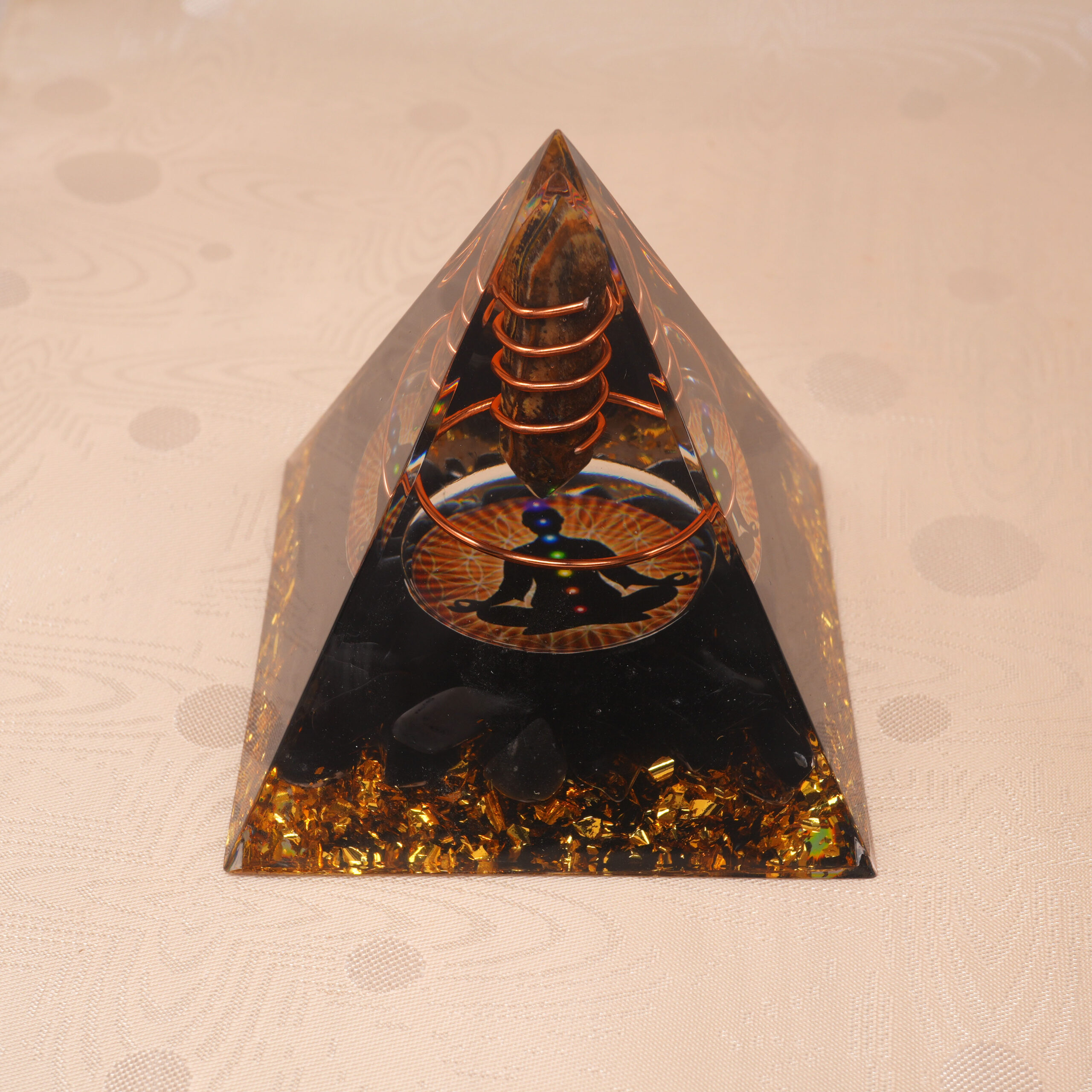 - Handcrafted pyramid combining tiger eye and obsidian
