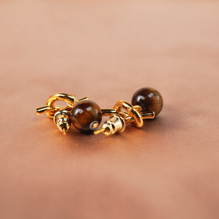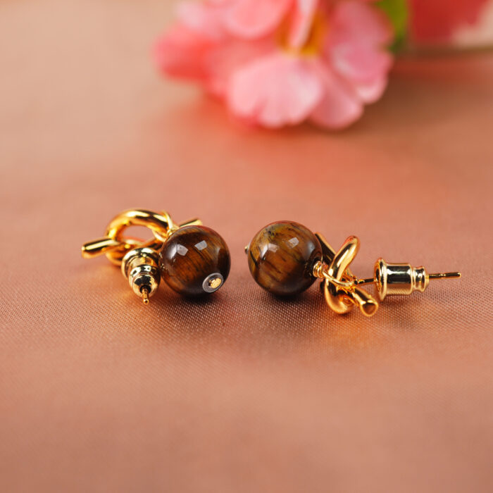 These earrings feature round tiger eye beads with golden-brown chatoyancy, symbolizing strength, focus, and protection. Known to attract luck and confidence, they transform negativity into positive energy while adding timeless style to any look.