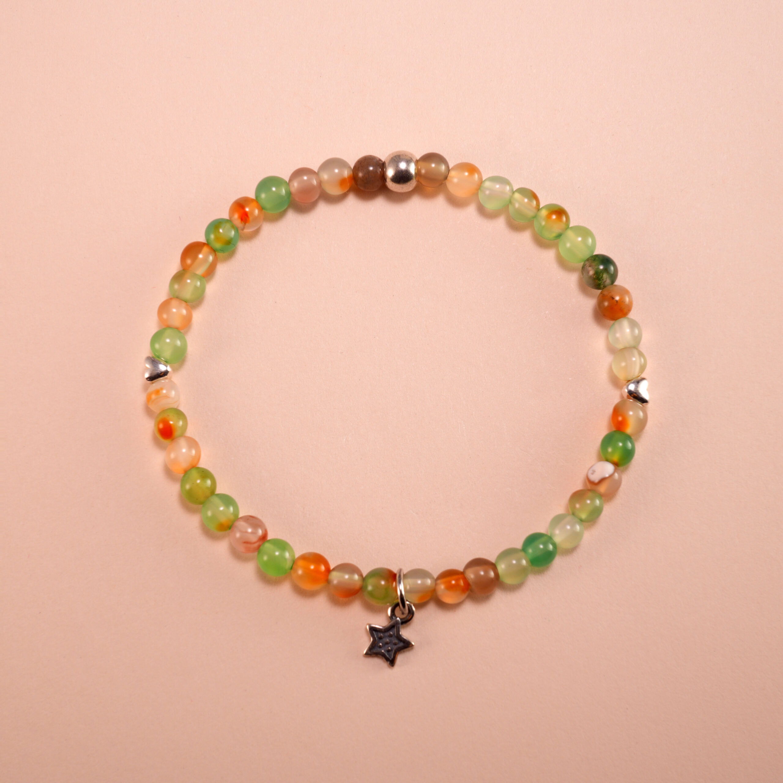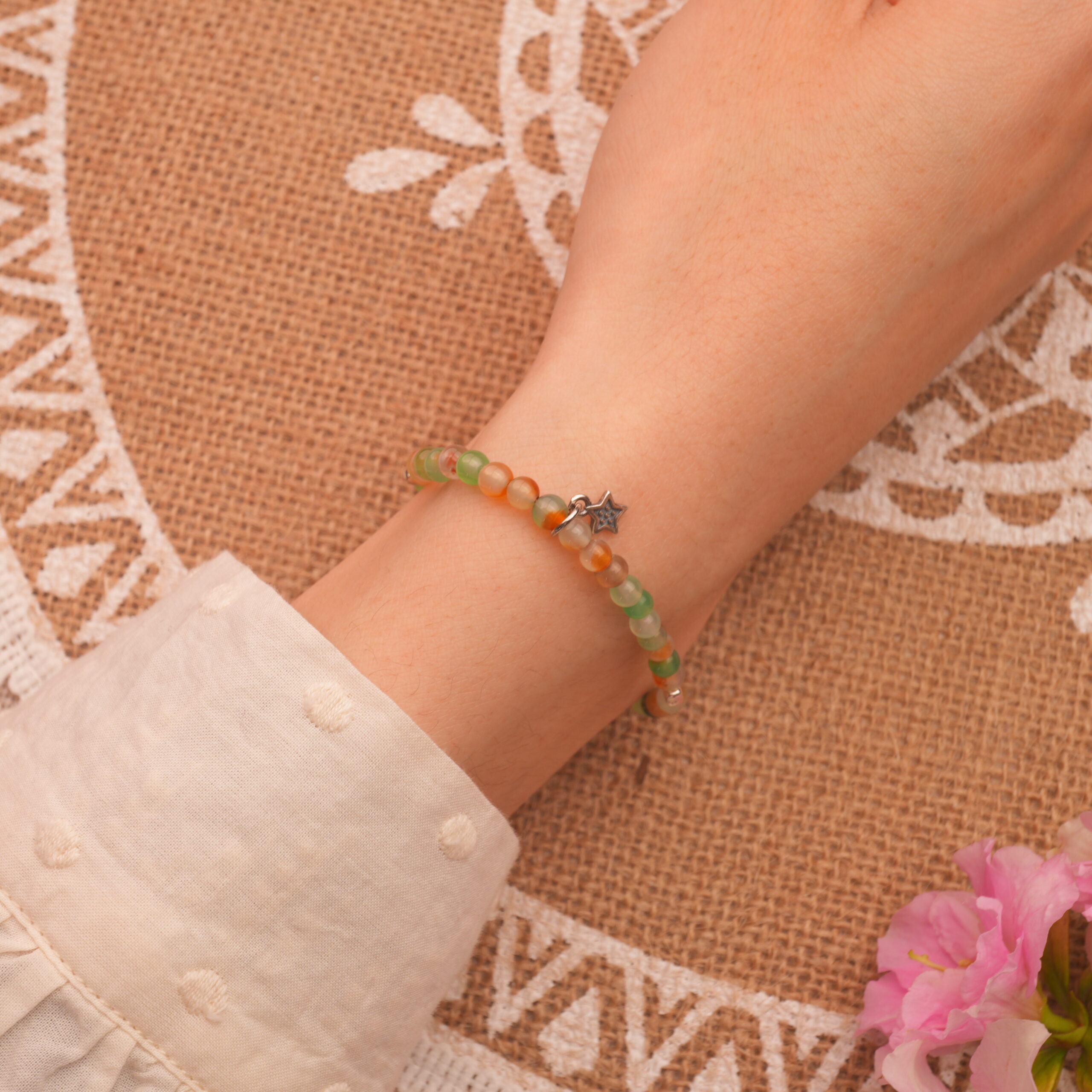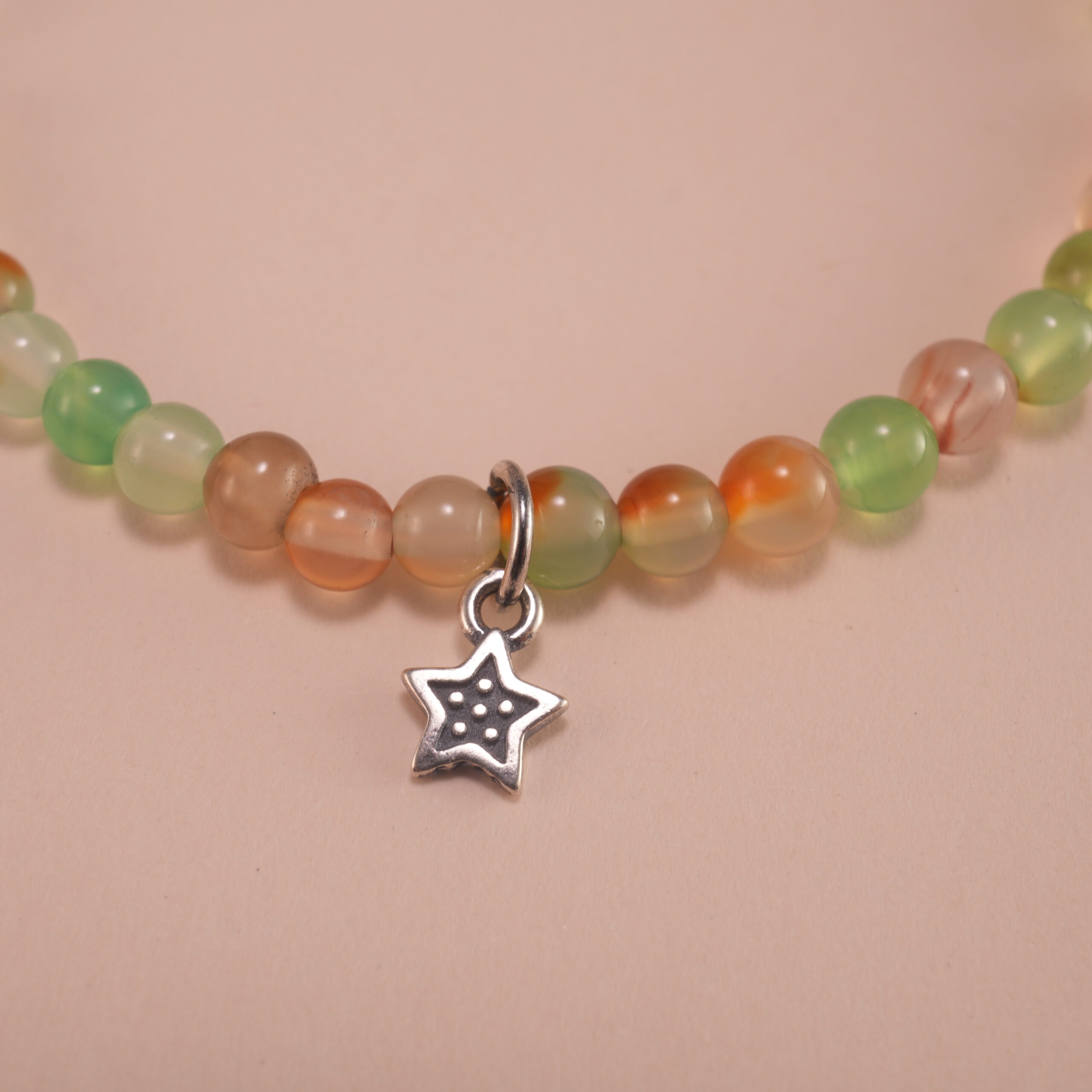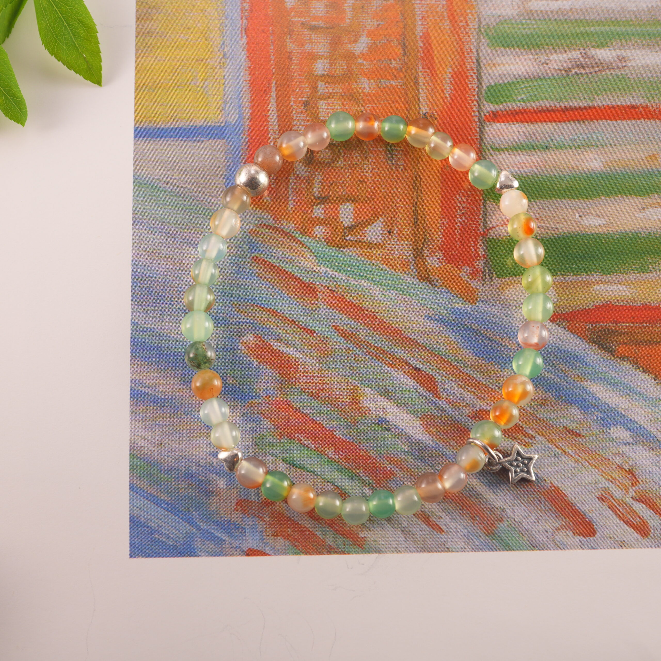 This elegant bracelet is composed of natural 4mm yellow-green chalcedony beads, paired with a sterling silver star charm to add a touch of sparkle. Its minimalist design suits those who appreciate subtle charm bracelets that bring tranquility and a gentle flow of positive energy.