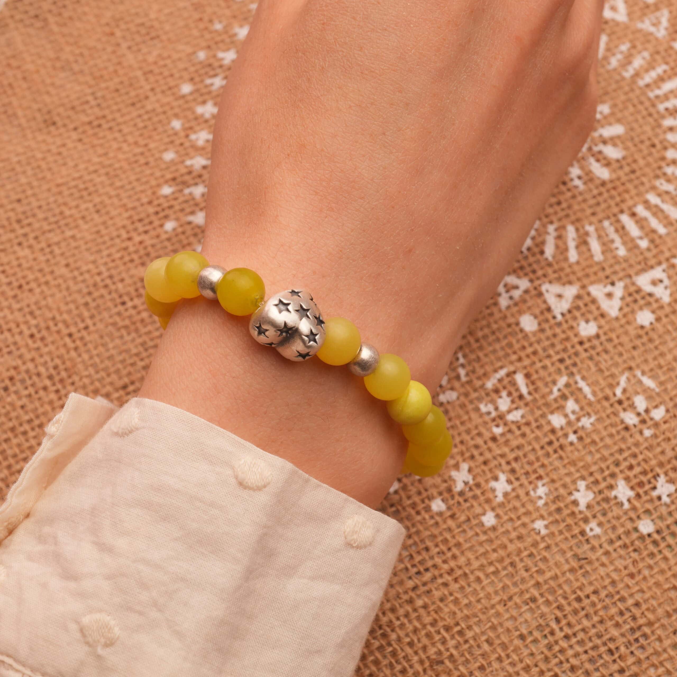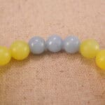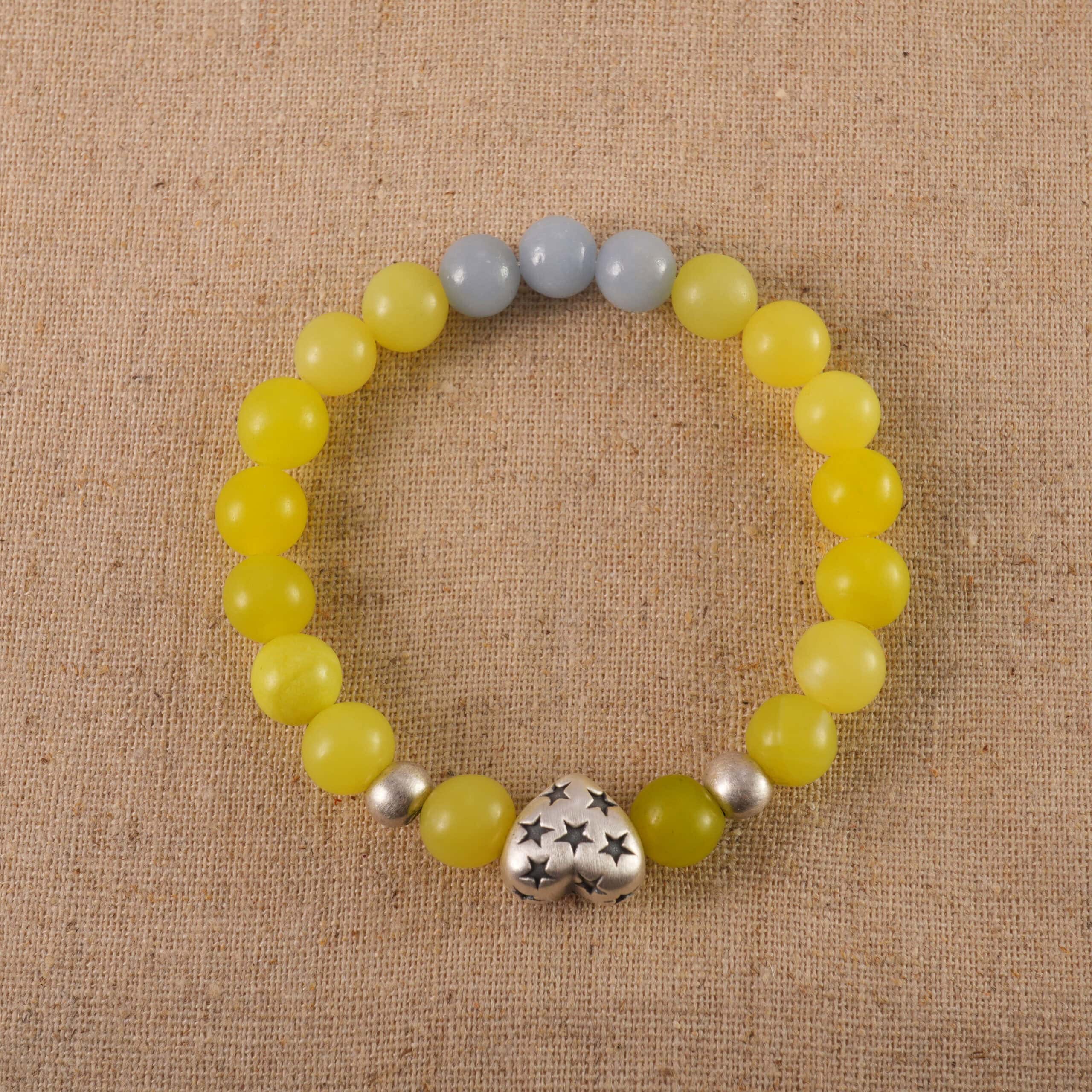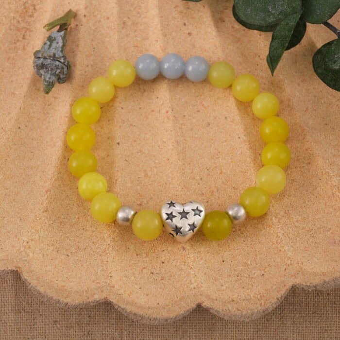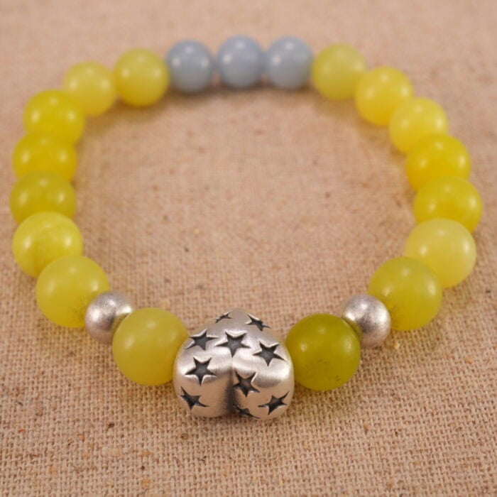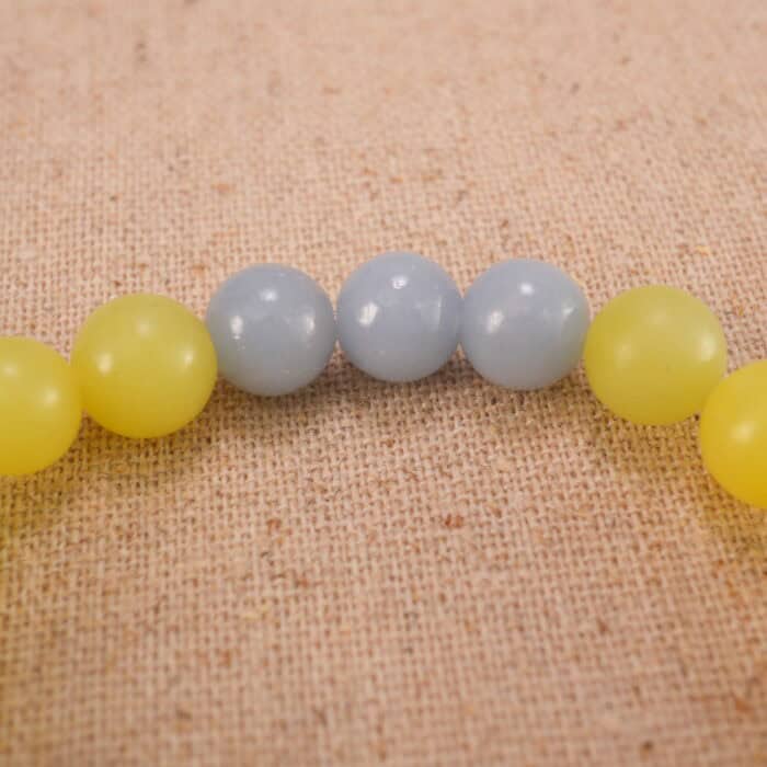 This 8 mm Yellow Jade and Blue Chalcedony bracelet, with a sterling silver clasp, promotes calmness and emotional healing. Designed with a minimalist approach, it combines soothing energies for mental clarity and tranquility. Ideal for fostering balance in daily life.